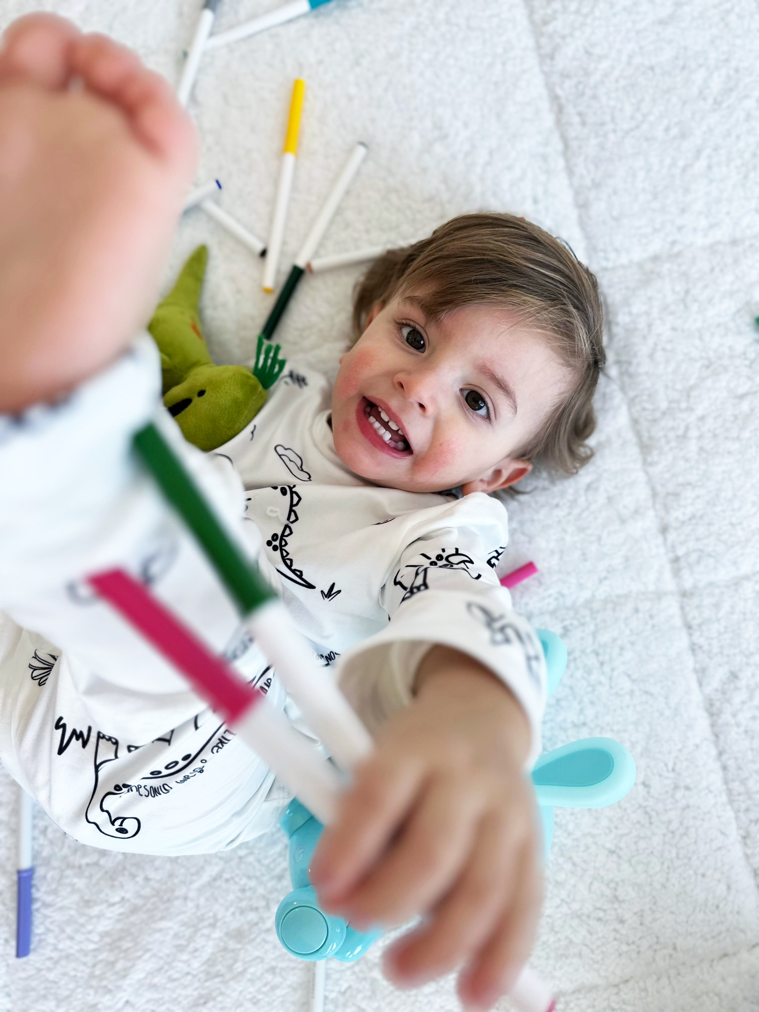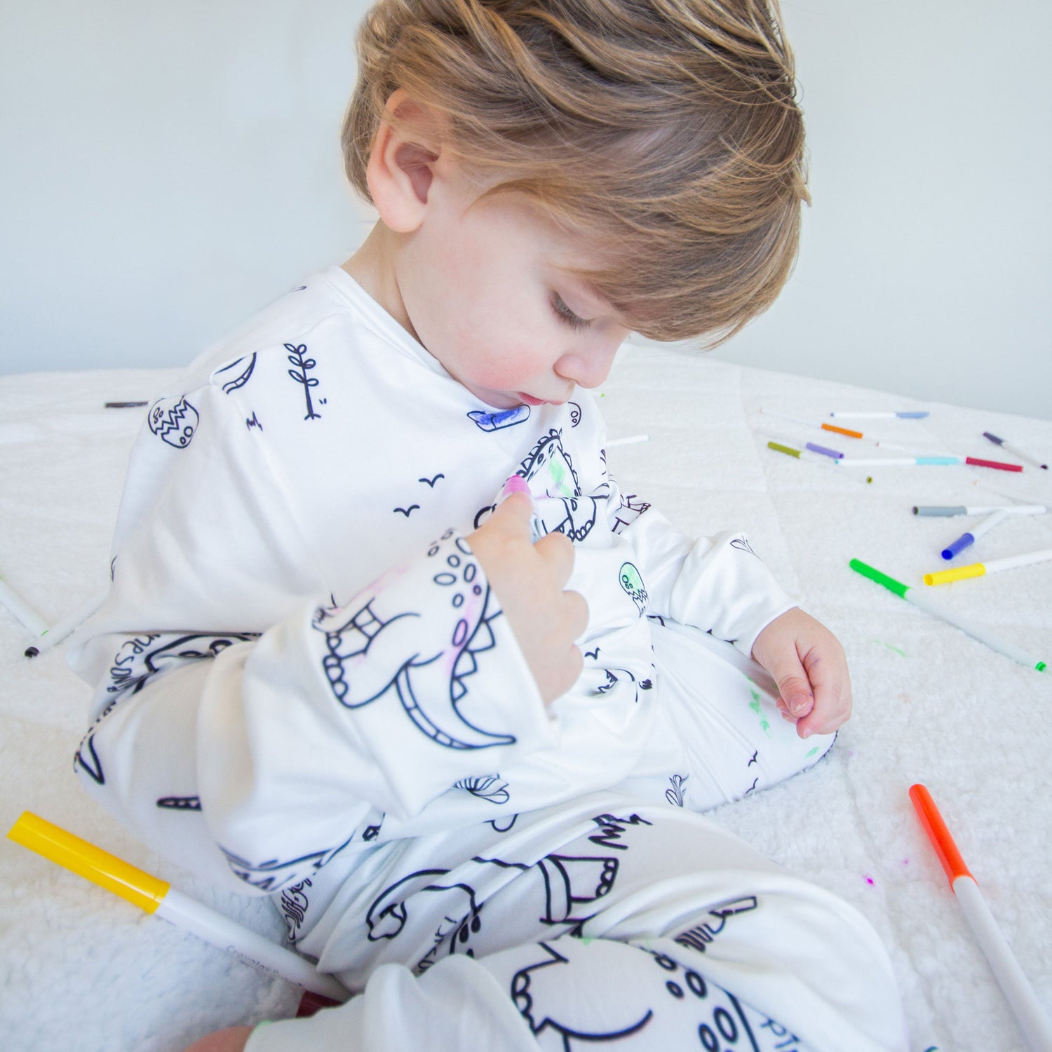 Our colorable pajamas are so much more than sleepwear—they’re a creative experience for your kids! Each pajama set features a unique design that children can color using the non-toxic, washable markers included in the kit. The best part? The colors disappear when washed, so they can color them as many times as they want!